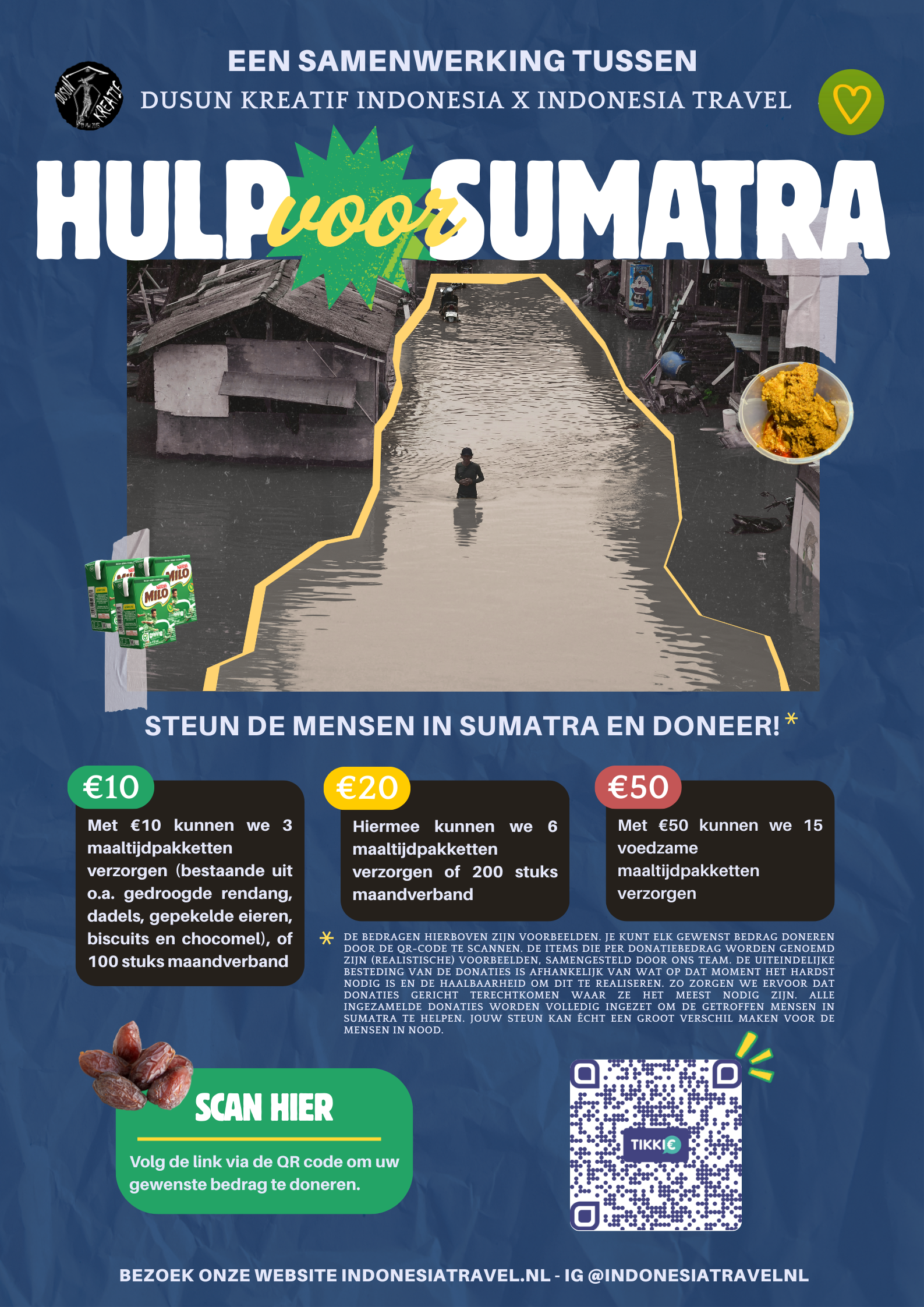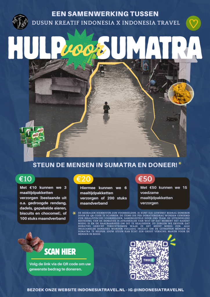 Eind november zijn de provincies Aceh, Noord- en West-Sumatra zwaar getroffen door overstromingen, ten gevolge van zware regenval en aardverschuivingen. De schade is desastreus en miljoenen mensen zijn door deze ramp geraakt. Samen met onze gidsen willen we de slachtoffers helpen door lokaal en gericht noodhulp toe te sturen. Help jij ons mee om de impact te vergroten? Alle beetjes helpen!
